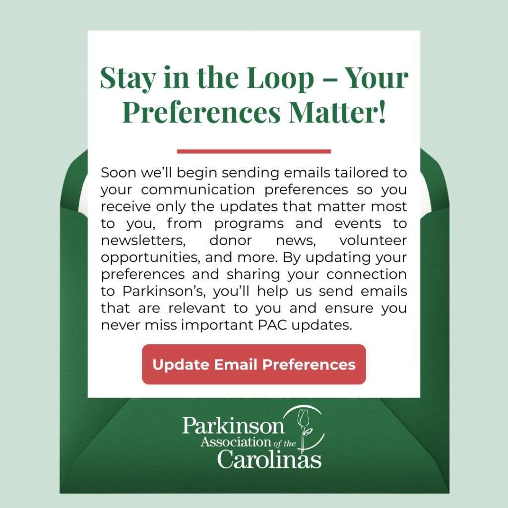 Living with Parkinson’s can feel overwhelming, but you don’t have to go through it alone. PAC maintains a listing of more than 50 support groups across the Carolinas for individuals with Parkinson’s and their care partners. These groups provide a safe and welcoming space to share experiences, learn from others, and build connections within the community. Visit PAC’s website to see if there’s a support group near you, and then contact PAC to learn more at 980-245-2786 or gschultz@parkinsonassociation.org.