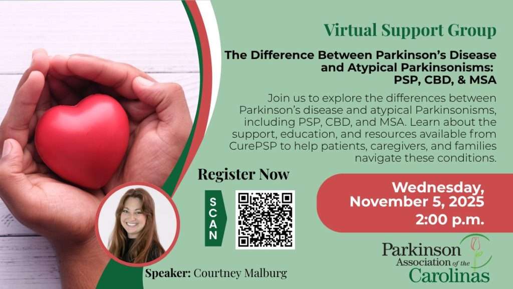 We invite everyone from our community to join us for our Virtual Support Group: FREE educational and interactive sessions on topics directly related to Parkinson’s disease via Zoom! We have had speakers talk about driving, balance, depression, and much more. Whether you are a person with Parkinson’s disease, a family member or friend, a caregiver, community member, or industry leader, we want to help you to be proactive while on this journey.