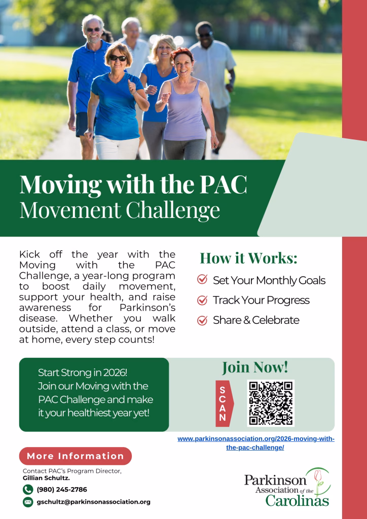The Parkinson Association of the Carolinas (PAC) is pleased to announce that registration is now open for the 2026 MoveIt! Walk Charlotte and the 2026 MoveIt! Walk Wilmington. These annual community events bring together individuals, families, and supporters from across the Carolinas to raise awareness and critical funds for those living with Parkinson’s disease. Questions? Contact Charlie Godfrey at 980-245-2786 or cgodfrey@parkinsonassociation.org.